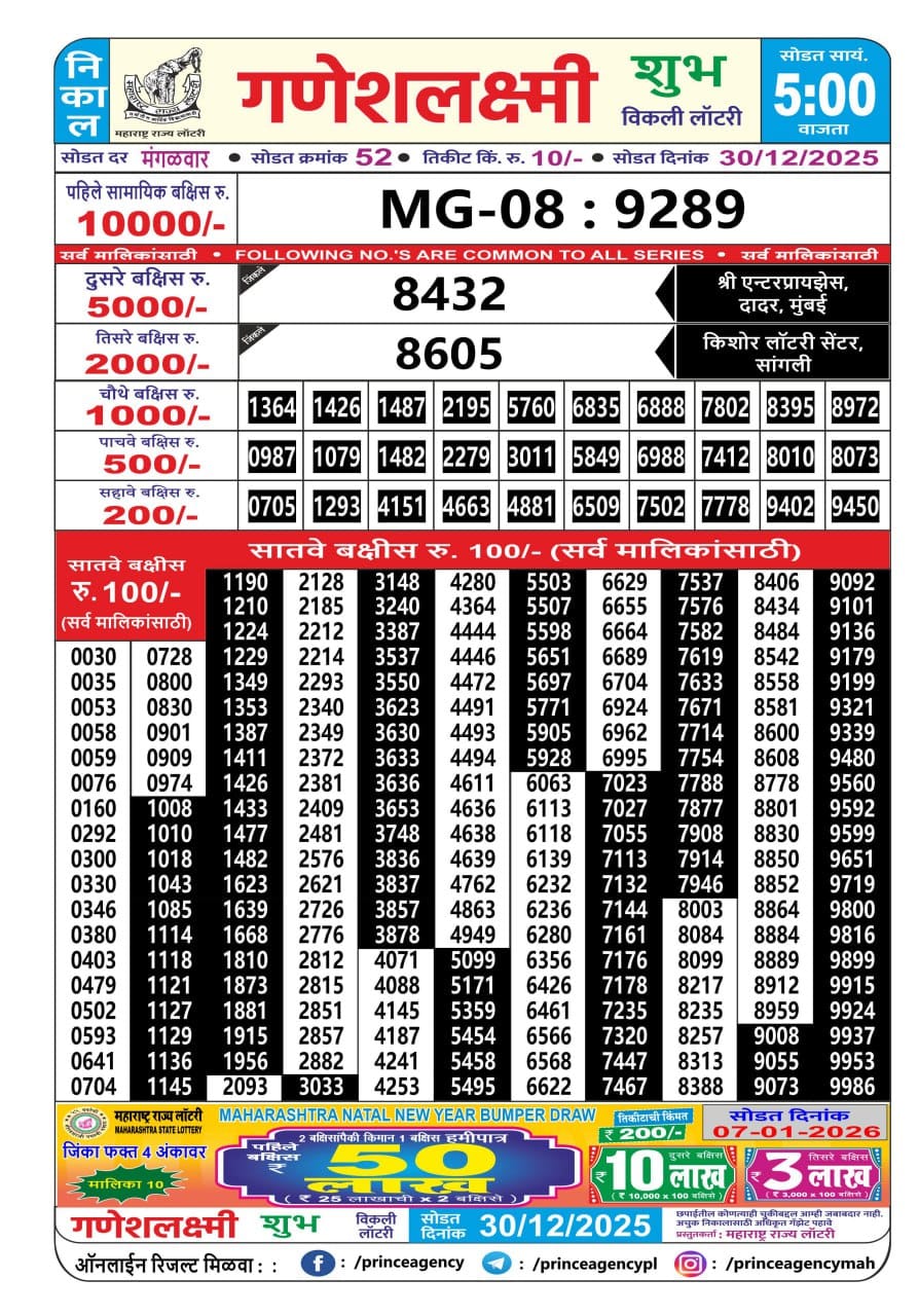 Maharashtra Ganeshlaxmi Weekly Lottery Result 30.12.2025 December 30, 2025 Leave a Comment on Maharashtra Ganeshlaxmi Weekly Lottery Result 30.12.2025 Share: XFacebookPinterestRedditVKDiggLinkedinMix Related Articles 0 23 Rajshree 50 Guru Weekly Lottery 7:30 PM Result 11.12.2025 0 53 Maharashtra Sahyadri Weekly Lottery 4:30 PM Result 08.10.2025 0 130 Dear Dasher Friday Weekly Lottery 6 Pm Result 16.05.2025 0 118 Dear 10 Green Tuesday Weekly 1:30 Pm Result 30.06.2025