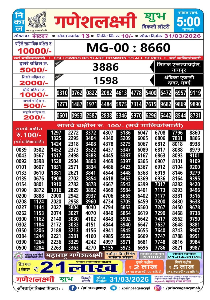 Maharashtra Ganeshlaxmi Weekly Lottery Result 31.03.2026 31 03 2026 Leave a Comment on Maharashtra Ganeshlaxmi Weekly Lottery Result 31.03.2026 Share: XFacebookPinterestRedditVKDiggLinkedinMix Related Articles 0 68 Dear Magic Sunday Weekly Lottery 8 PM Result 25.01.2026 0 109 Rajshree lotus Weekly Lottery 4 PM Result 13.11.2025 0 35 Rajshree Sunday Weekly Lottery 8 PM Result 08.03.2026 0 64 Rajshree Night 9pm Lottery Result 05.01.2026