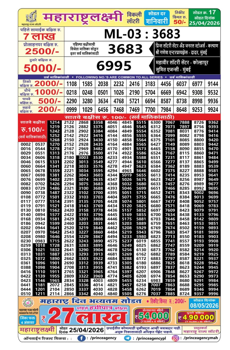 Maharashtra Maharashtra Laxmi Weekly Lottery Draw Result 25.04.2026 25 04 2026 Leave a Comment on Maharashtra Maharashtra Laxmi Weekly Lottery Draw Result 25.04.2026 Share: XFacebookPinterestRedditVKDiggLinkedinMix Related Articles 0 82 Maharashtra Gajlaxmi Weekly Lottery Result 08.02.2026 0 109 Labh Laxmi Charm Tuesday Weekly Lottery 4 PM Result 06.01.2026 0 78 Rajshree Night 9pm Lottery Result 13.02.2026 0 29 Rajshree 10 Evening Weekly Lottery 5:40 PM Result 07.04.2026