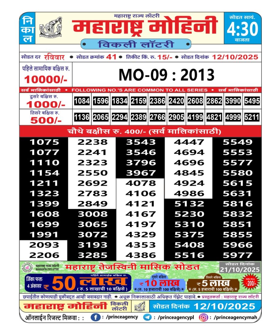 Maharashtra Mohini Weekly Lottery 4.30 PM Result 12.10.2025 October 12, 2025 Leave a Comment on Maharashtra Mohini Weekly Lottery 4.30 PM Result 12.10.2025 Share: XFacebookPinterestRedditVKDiggLinkedinMix Related Articles 0 76 Labh Laxmi Power Sunday Weekly Lottery 4 PM Result 27.4.25 0 35 Rajshree Marigold Weekly Lottery 4 PM Result 13.10.2025 0 65 Rajshree 250 Monthly Lottery Result 01.07.2025 0 111 Dear Finch Monday Weekly Lottery 8 PM Result 28.04.25