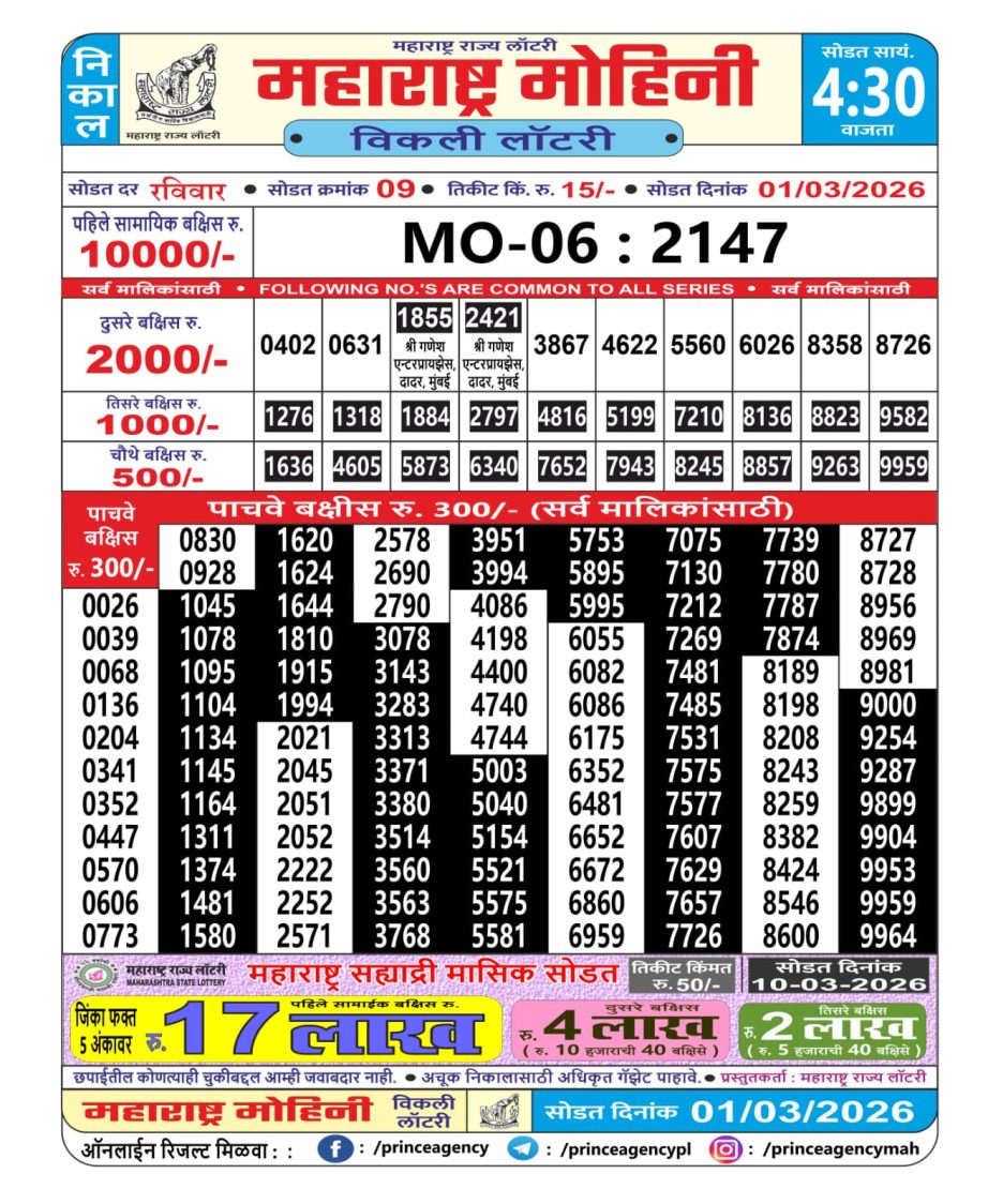 Maharashtra Mohini Weekly Lottery Result 01.03.2026 March 1, 2026 Leave a Comment on Maharashtra Mohini Weekly Lottery Result 01.03.2026 Share: XFacebookPinterestRedditVKDiggLinkedinMix Related Articles 0 25 Golden Star Mangal Weekly Lottery 7 PM Result 24.02.2026 0 25 Rajshree Shukra Weekly Lottery 2.25PM Result 13.02.2026 0 253 Golden Star Shukra Weekly Lottery 9 Pm Result 9 May 2025 0 95 Golden Star Ravi Weekly Lottery 9 PM Result 26.10.2025