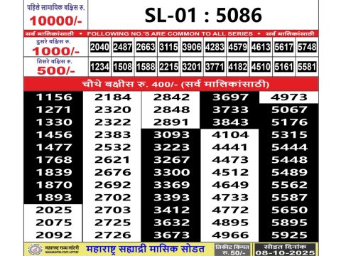 Maharashtra Padmini Weekly Lottery 4.15 PM Result 16.09.2025 September 16, 2025 Leave a Comment on Maharashtra Padmini Weekly Lottery 4.15 PM Result 16.09.2025 Share: XFacebookPinterestRedditVKDiggLinkedinMix Related Articles 0 41 Maharashtra Sahyadri Weekly Lottery 4.30 PM Result 29.09.2025 0 94 Rajshree 10 Evening Weekly Lottery 5:40 PM Result 27.04.2025 0 72 Labh Laxmi Glad Thursday Weekly Lottery 4 PM Result 31.07.2025 0 202 Maharashtra Laxmi Weekly Lottery 4:15 Pm Result 31.05.2025