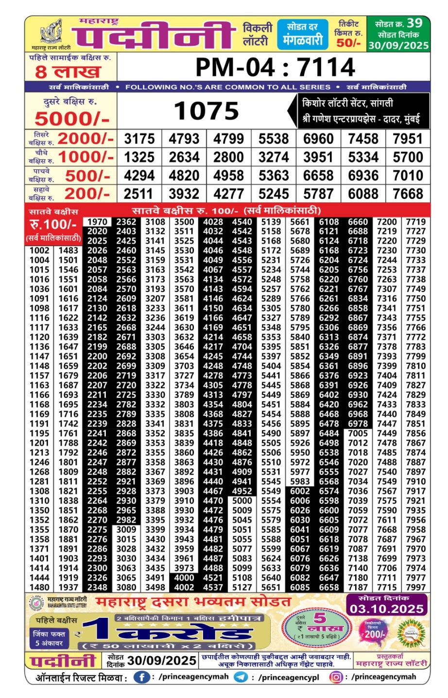 Maharashtra Padmini Weekly Lottery 4.15 PM Result 30.09.2025 September 30, 2025 Leave a Comment on Maharashtra Padmini Weekly Lottery 4.15 PM Result 30.09.2025 Share: XFacebookPinterestRedditVKDiggLinkedinMix Related Articles 0 44 Dear Godavari Tuesday Weekly Lottery 1 PM Result 30.09.2025 0 26 Rajshree Orchid Weekly Lottery 4 PM Result 18.10.2025 0 58 Dear 10 Pink Thursday Weekly Lottery 1:30 PM Result 14.08.2025 0 34 Maharashtra Ganeshlaxmi Weekly Lottery 5 PM Result 21.09.2025