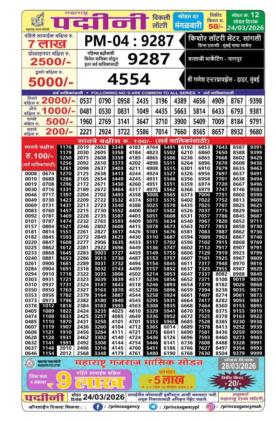 Maharashtra Padmini Weekly Lottery Draw Result 24.03.2026 24 03 2026 Leave a Comment on Maharashtra Padmini Weekly Lottery Draw Result 24.03.2026 Share: XFacebookPinterestRedditVKDiggLinkedinMix Related Articles 0 66 Golden Star Guru Weekly Lottery 9 PM Result 05.02.2026 0 26 Rajshree Friday Weekly Lottery 8 PM Result 27.03.2026 0 59 Rajshree 10 Evening Weekly Lottery 5:40 PM Result 10.01.2026 0 56 Rajshree Marigold Weekly Lottery 4 PM Result 12.01.2026