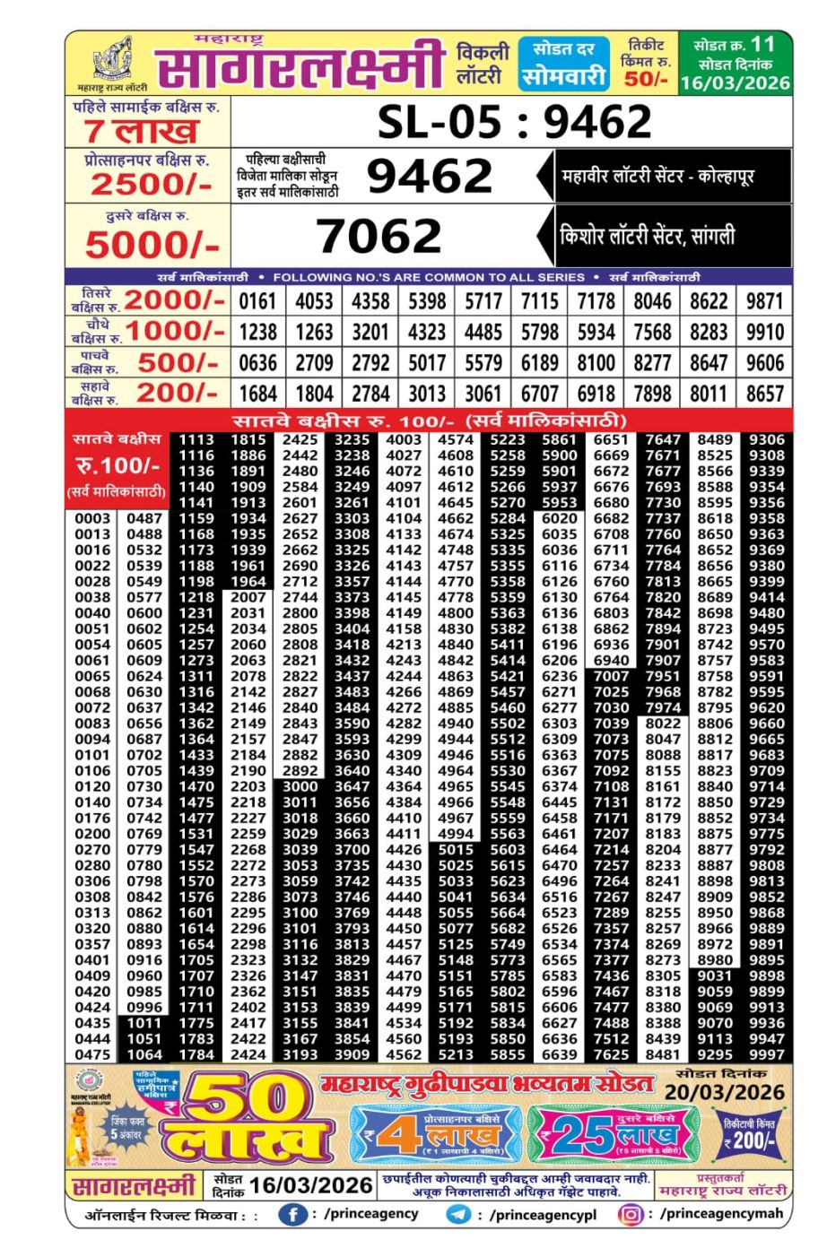Maharashtra Sagar Laxmi Weekly Lottery Draw Result 16.03.2026 16 03 2026 Leave a Comment on Maharashtra Sagar Laxmi Weekly Lottery Draw Result 16.03.2026 Share: XFacebookPinterestRedditVKDiggLinkedinMix Related Articles 0 28 Rajshree Mangal Weekly Lottery 2.25PM Result 24.03.2026 0 138 Punjab State Dear 50 Ranger sunday Weekly Lottery 6 PM Result 16.11.2025 0 70 Rajshree Lotus Weekly Lottery 4 PM Result 08.01.2026 0 53 Maharashtra Sahyadri Lottery Result 06.02.2026