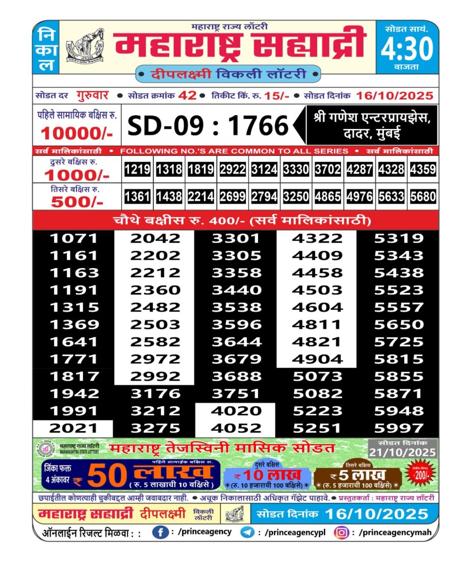 Maharashtra Sahyadri Weekly Lottery 4.30 PM Result 16.10.2025 October 16, 2025 Leave a Comment on Maharashtra Sahyadri Weekly Lottery 4.30 PM Result 16.10.2025 Share: XFacebookPinterestRedditVKDiggLinkedinMix Related Articles 0 22 Rajshree Night Lottery 9pm Result 25.10.2025 0 74 Dear Dasher Friday Weekly Lottery 6 Pm Result 23.05.2025 0 96 Maharashtra SagarLaxmi Weekly Lottery 4 :15 PM Result 28.04.25 0 82 Rajshree 10 Evening Weekly Lottery 5:40 Pm Result 29.05.2025
