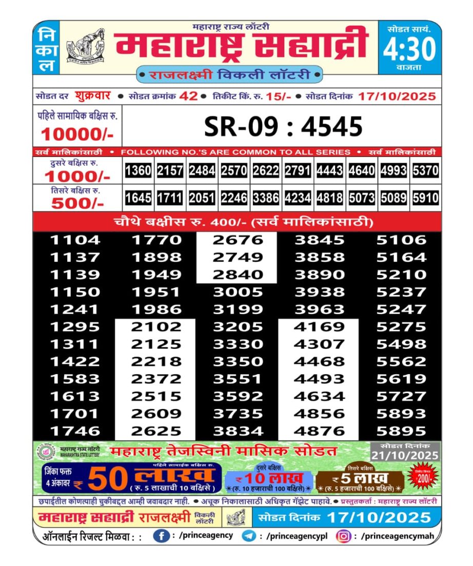 Maharashtra Sahyadri Weekly Lottery 4.30 PM Result 17.10.2025 October 17, 2025 Leave a Comment on Maharashtra Sahyadri Weekly Lottery 4.30 PM Result 17.10.2025 Share: XFacebookPinterestRedditVKDiggLinkedinMix Related Articles 0 28 Rajshree 50 Shukra Weekly Lottery 7:30 PM Result 24.10.2025 0 91 Rajshree Friday Weekly Lottery 8 Pm Result 16.05.2025 0 67 Dear Donner Saturday Weekly Lottery 6 Pm Result 14.06.2025 0 82 Labh Laxmi Power Sunday Weekly Lottery 4 Pm Result 11.5.2025