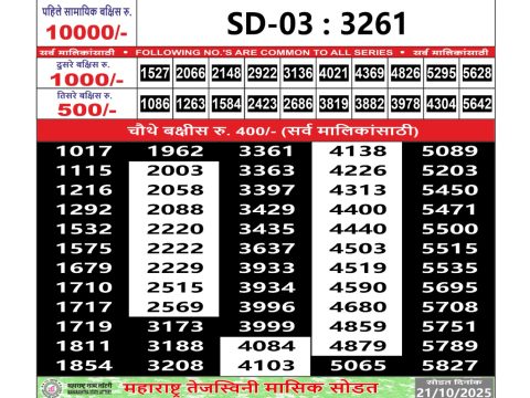 Maharashtra Sahyadri Weekly Lottery 4.30 PM Result 26.09.2025 September 26, 2025 Leave a Comment on Maharashtra Sahyadri Weekly Lottery 4.30 PM Result 26.09.2025 Share: XFacebookPinterestRedditVKDiggLinkedinMix Related Articles 0 26 Maharashtra Sahyadri Weekly Lottery 4.30 PM Result 09.10.2025 0 65 Rajshree 30 Ravi Weekly Lottery 8:30 PM Result 20.07.2025 0 32 Maharashtra Sahyadri monthly lottery result 08.10.2025 0 29 Maharashtra Gajlaxmi Weekly Lottery 4.45 PM Result 10.10.2025