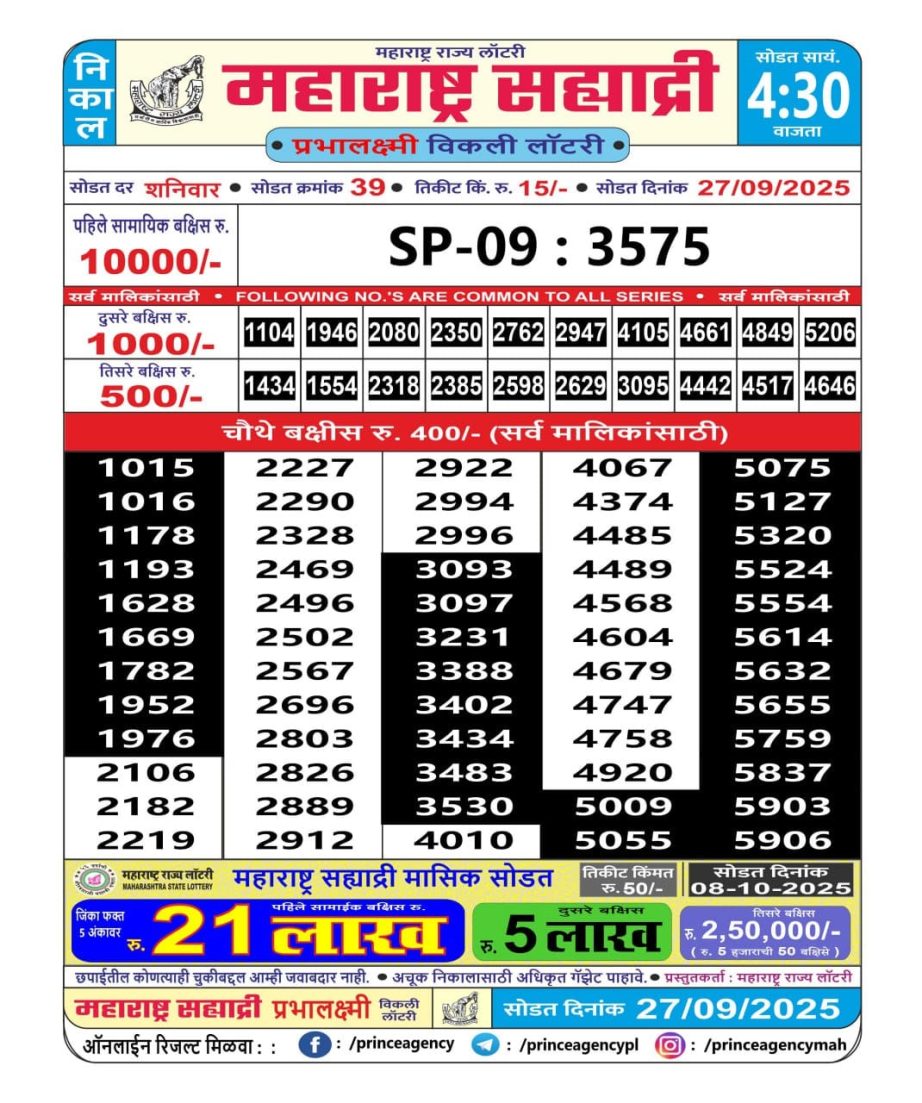 Maharashtra Sahyadri Weekly Lottery 4.30 PM Result 27.09.2025 September 27, 2025 Leave a Comment on Maharashtra Sahyadri Weekly Lottery 4.30 PM Result 27.09.2025 Share: XFacebookPinterestRedditVKDiggLinkedinMix Related Articles 0 41 Dear 10 Oak Thursday Weekly Lottery 7 PM Result 18.09.2025 0 28 Rajshree 50 Mangal Weekly Lottery 7:30 PM Result 21.10.2025 0 42 Maharashtra Gajlaxmi Weekly Lottery 4.45 PM Result 30.09.2025 0 73 Dear Super Iron Saturday Weekly Lottery 7 Pm Result 14.06.2025