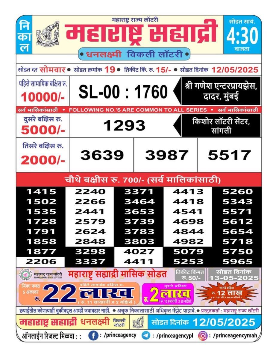 Maharashtra Sahyadri Weekly Lottery 4:30 PM Result 12.05.2025 May 12, 2025 Leave a Comment on Maharashtra Sahyadri Weekly Lottery 4:30 PM Result 12.05.2025 Share: XFacebookPinterestRedditVKDiggLinkedinMix Related Articles 0 42 PUNJAB STATE 200 DEAR Monthly Lottery Result declared 01.11.2025 0 68 Rajshree 50 Mangal Weekly Lottery 7:30 PM Result 22.07.2025 0 18 Maharashtra Ganeshlaxmi Weekly Lottery Result, 5pm, 23.11.2025 0 14 Dear Prestige Tuesday Weekly Lottery 6 PM Result 02.12.2025