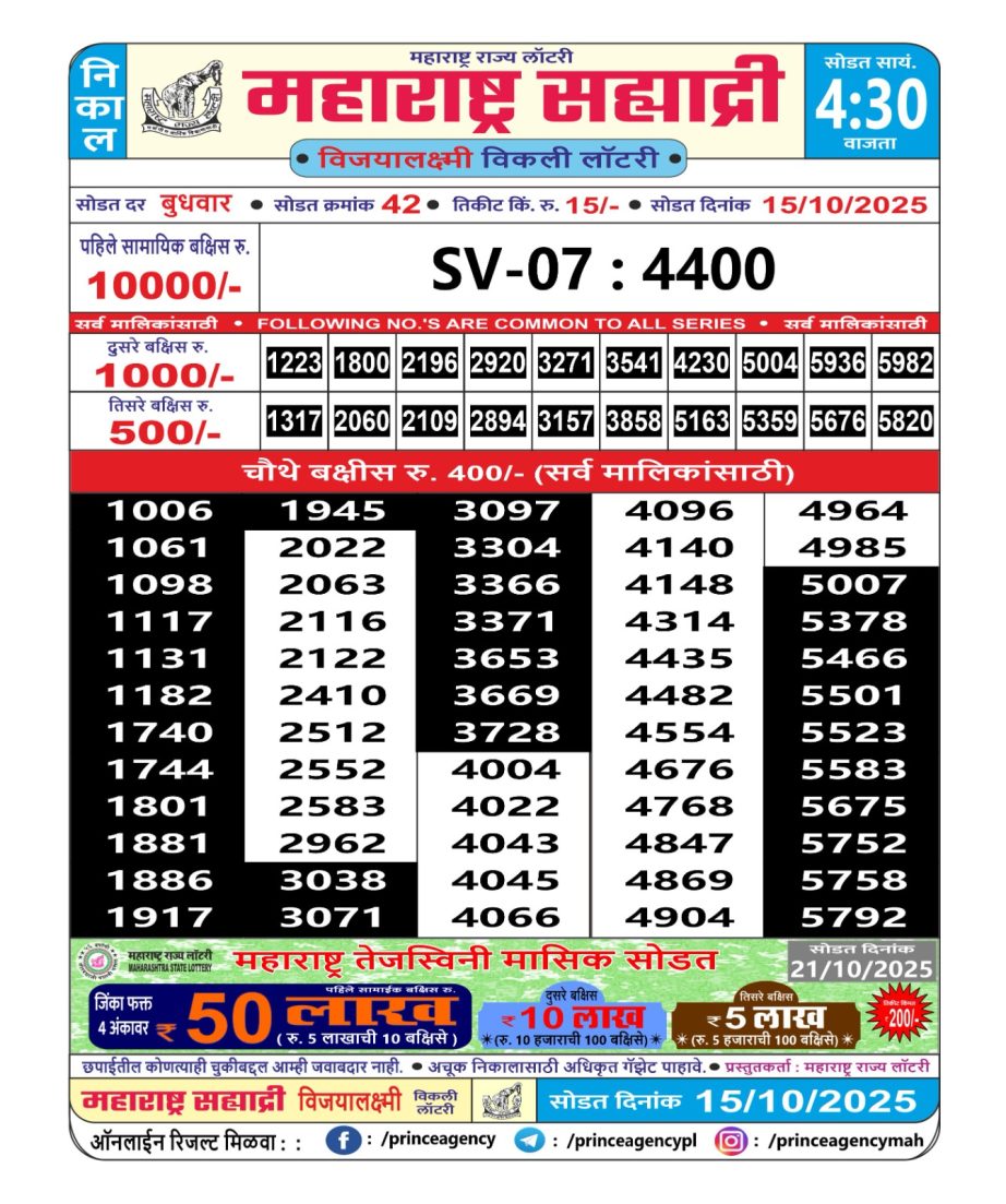 Maharashtra Sahyadri Weekly Lottery 4:30 PM Result 15.10.2025 October 15, 2025 Leave a Comment on Maharashtra Sahyadri Weekly Lottery 4:30 PM Result 15.10.2025 Share: XFacebookPinterestRedditVKDiggLinkedinMix Related Articles 0 117 Dear 10 Orange Wednesday Weekly 1:30 Pm Result 7.5.2025 0 74 Maharashtra Gajlaxmi Weekly Lottery 4.45 PM Result 09.07.2025 0 24 Rajshree Orchid Weekly Lottery 4 PM Result 18.10.2025 0 79 Dear Meghna Friday Weekly Lottery 1 PM Result 05.09.2025