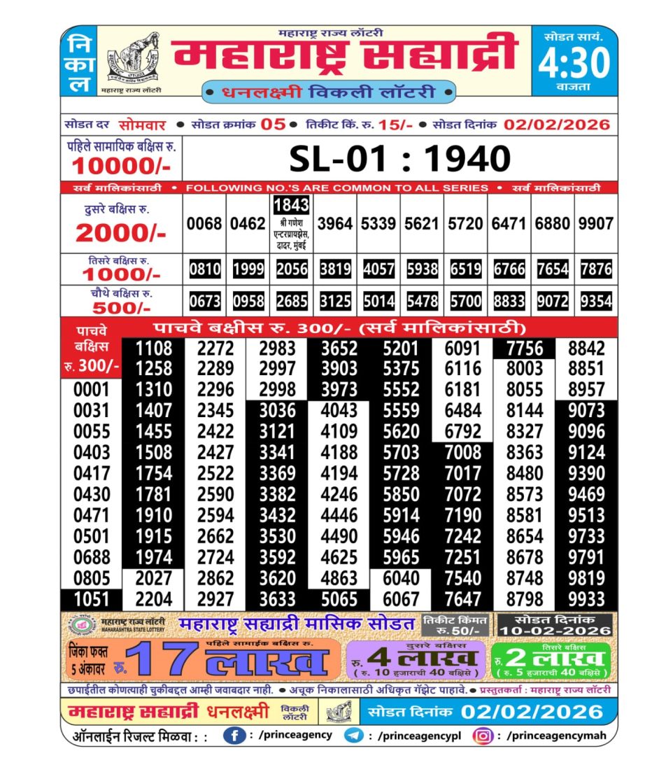 Maharashtra Sahyadri Weekly Lottery Result 02.02.2026 February 2, 2026 Leave a Comment on Maharashtra Sahyadri Weekly Lottery Result 02.02.2026 Share: XFacebookPinterestRedditVKDiggLinkedinMix Related Articles 0 140 Maharashtra Sahyadri Weekly Lottery 4:30 PM Result 03.05.25 0 156 Rajshree Guru Weekly Lottery 1:00 PM Result 01.05.2025 0 76 Rajshree 10 Evening Weekly Lottery 5:40 PM Result 04.10.2025 0 72 Golden Star Ravi Weekly Lottery 9 PM Result 19.10.2025