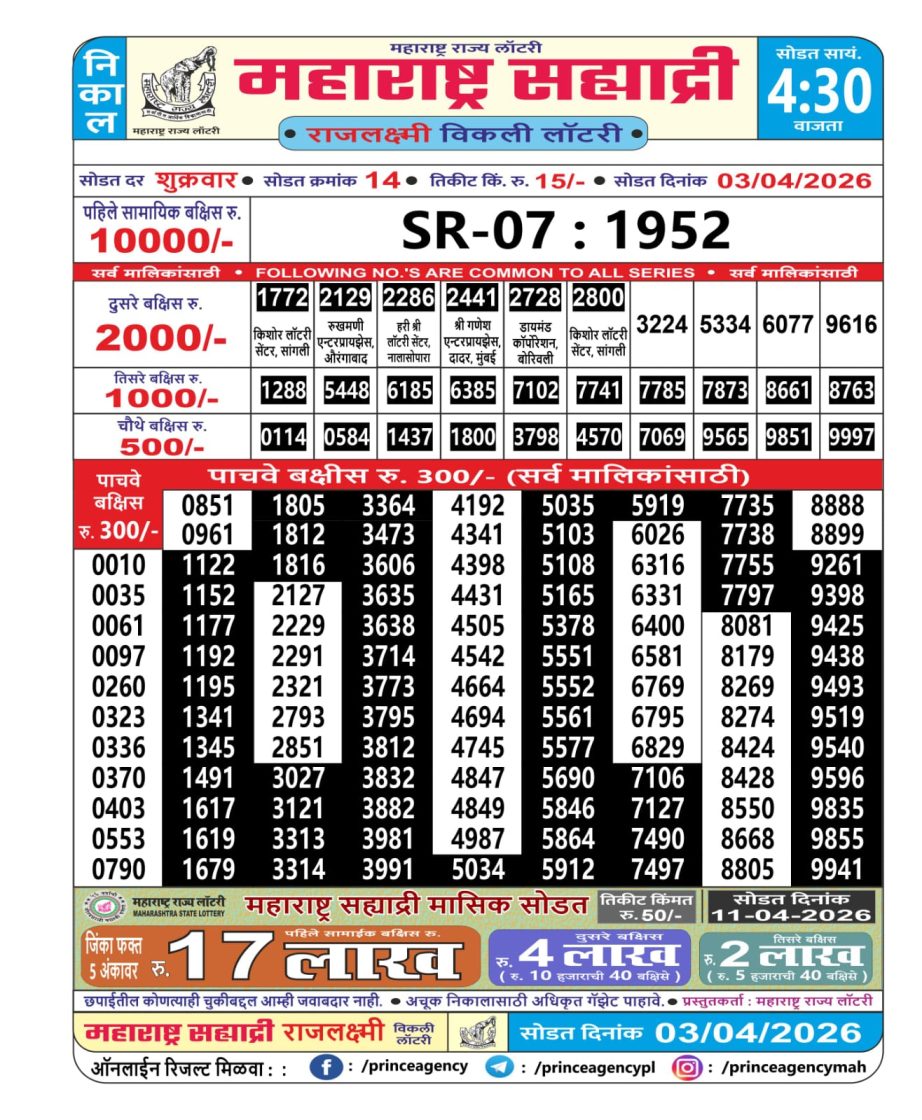 Maharashtra Sahyadri Weekly Lottery Result 03.04.2026 03 04 2026 Leave a Comment on Maharashtra Sahyadri Weekly Lottery Result 03.04.2026 Share: XFacebookPinterestRedditVKDiggLinkedinMix Related Articles 0 58 Maharashtra Gajlaxmi Weekly Lottery Result 04.02.2026 0 60 Labh Laxmi Joy Saturday Weekly Lottery 4 PM Result 31.01.2026 0 24 Labh Laxmi Power Sunday Weekly Lottery 4 PM Result 22.03.2026 0 102 Dear Supreme Thursday Weekly Lottery 6 PM Result 18.12.2025