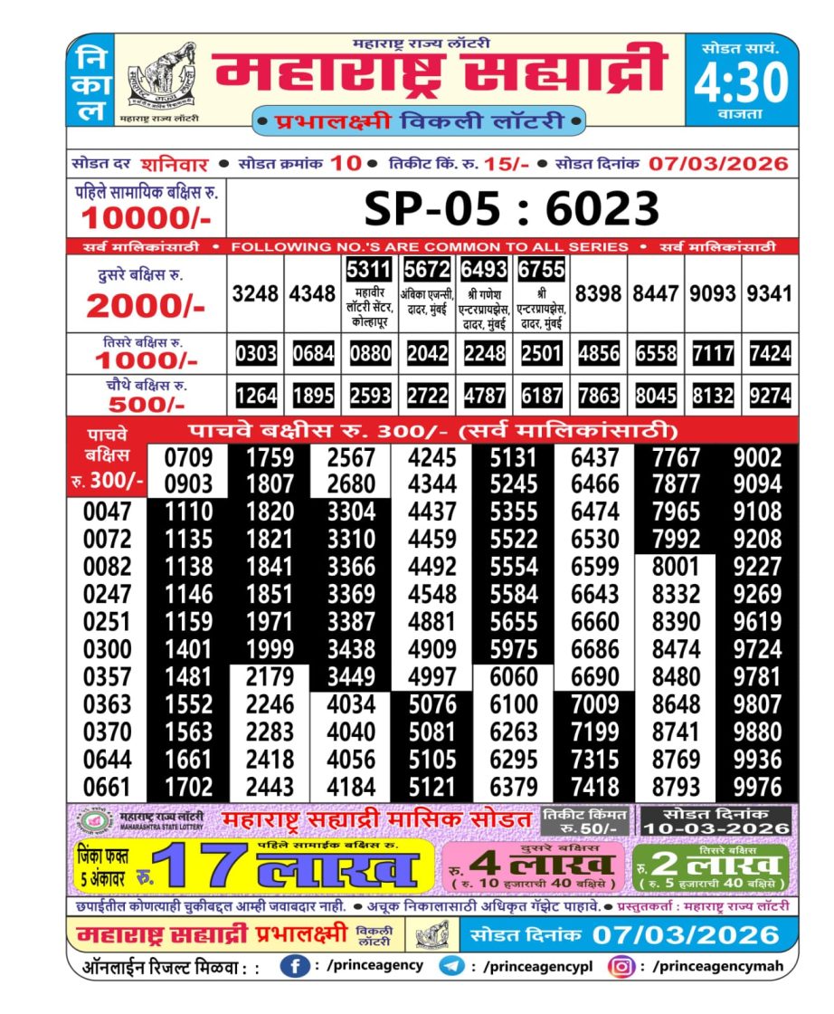 Maharashtra Sahyadri Weekly Lottery Result 07.03.2026 March 7, 2026 Leave a Comment on Maharashtra Sahyadri Weekly Lottery Result 07.03.2026 Share: XFacebookPinterestRedditVKDiggLinkedinMix Related Articles 0 31 Rajshree Ravi Weekly Lottery 2.25PM Result 15.02.2026 0 97 Maharashtra Padmini Weekly Lottery 4.15 PM Result 28.10.2025 0 184 Dear 10 Blue Monday Weekly 1:30 Pm Result 16.06.2025 0 184 Dear 10 Wonder Sunday Weekly Lottery 7 Pm Result 18.05.2025