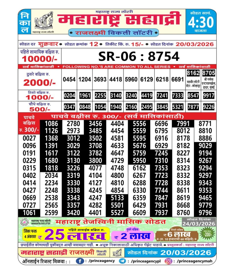 Maharashtra Sahyadri Weekly Lottery Result 20.03.2026 20 03 2026 Leave a Comment on Maharashtra Sahyadri Weekly Lottery Result 20.03.2026 Share: XFacebookPinterestRedditVKDiggLinkedinMix Related Articles 0 38 Rajshree Sunflower Weekly Lottery 4 PM Result 08.03.2026 0 25 Punjab State Dear 50 Chief Thursday Weekly Lottery 5 PM Result 26.03.2026 0 69 Maharashtra Sagar Laxmi Weekly Lottery Draw Result 12.01.2026 0 63 Rajshree 50 Guru Weekly Lottery 7:30 PM Result 19.02.2026