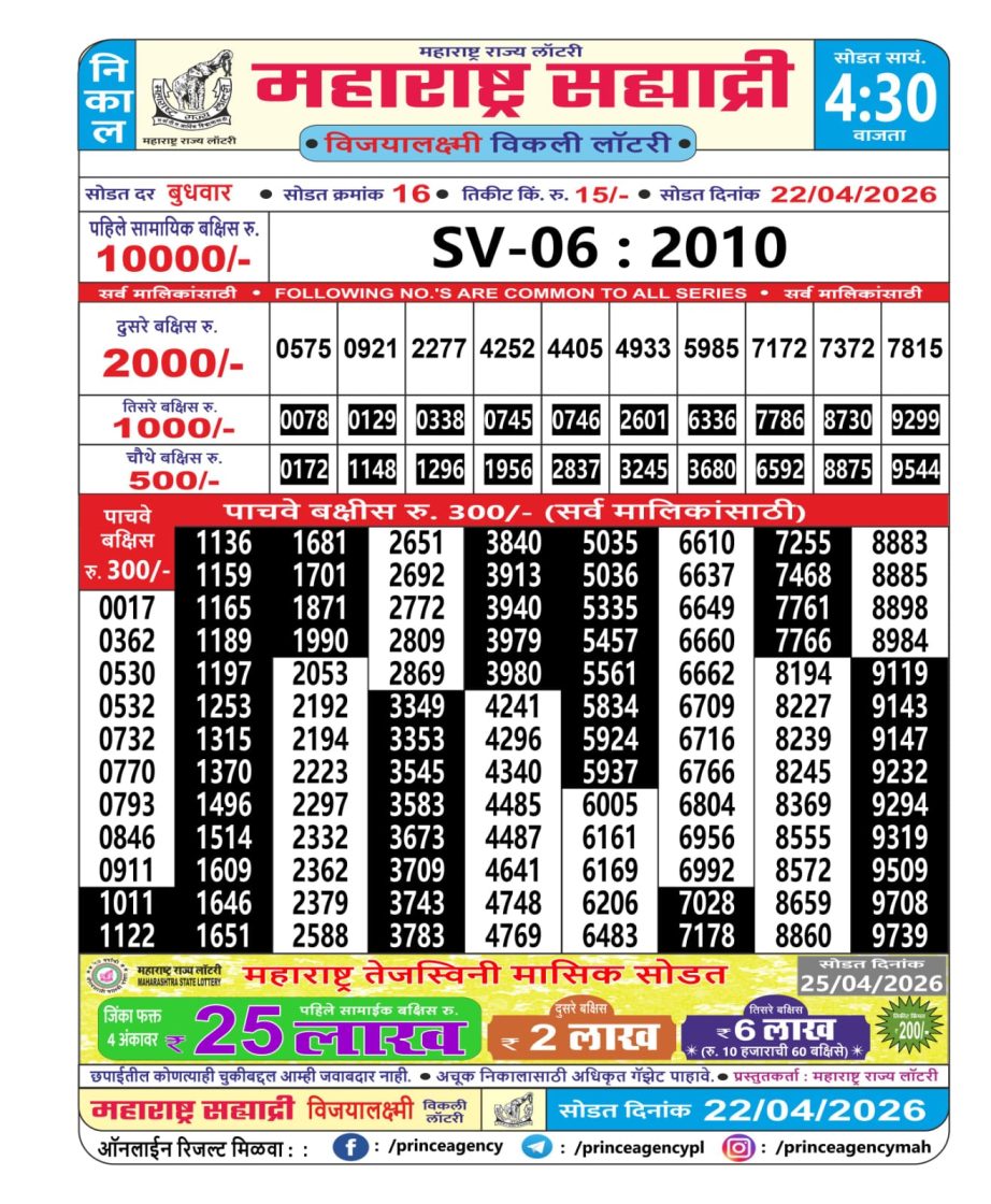 Maharashtra Sahyadri Weekly Lottery Result 22.04.2026 22 04 2026 Leave a Comment on Maharashtra Sahyadri Weekly Lottery Result 22.04.2026 Share: XFacebookPinterestRedditVKDiggLinkedinMix Related Articles 0 160 Maharashtra Sahyadri Weekly Lottery Result 28.11.2025 0 22 Maharashtra Sahyadri Weekly Lottery Result 14.04.2026 0 13 Dear Spark Wednessday Weekly Lottery 1 PM Result 15.04.2026 0 70 Rajshree Night 9pm Lottery Result 10.01.2026