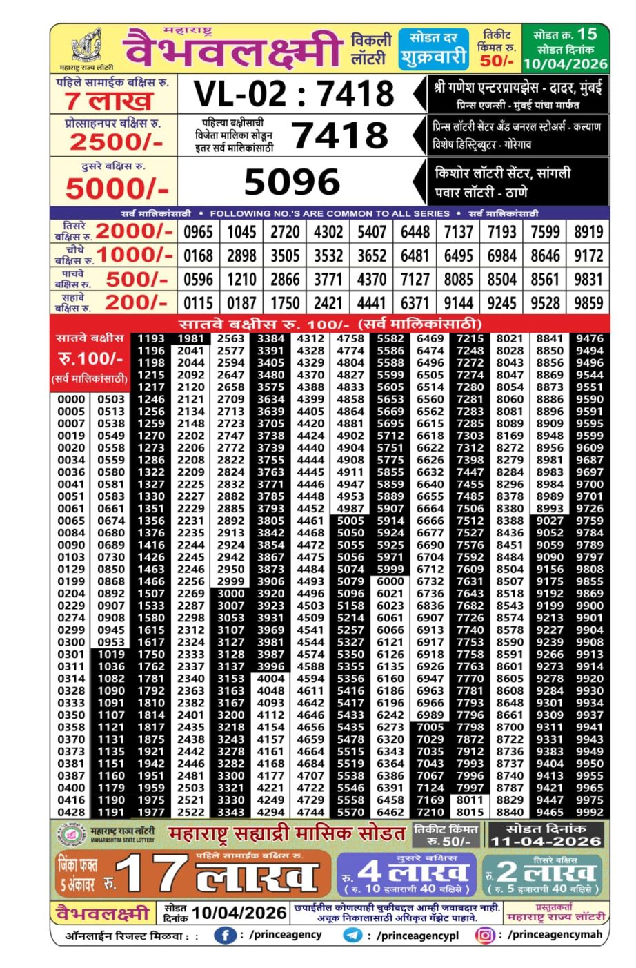 Maharashtra Vaibhav Laxmi Weekly Lottery Draw Result 10.04.2026 10 04 2026 Leave a Comment on Maharashtra Vaibhav Laxmi Weekly Lottery Draw Result 10.04.2026 Share: XFacebookPinterestRedditVKDiggLinkedinMix Related Articles 0 68 Dear Destiny Tuesday Weekly Lottery 8 PM Result 24.02.2026 0 88 Rajshree 100 monthly 6:30 pm Lottery result 01.01.2026 Published 0 71 Maharashtra State Gourav Monthly Lottery Results 16.12.2025 Check out 0 60 Maharashtra Sahyadri Lottery Result 07.02.2026