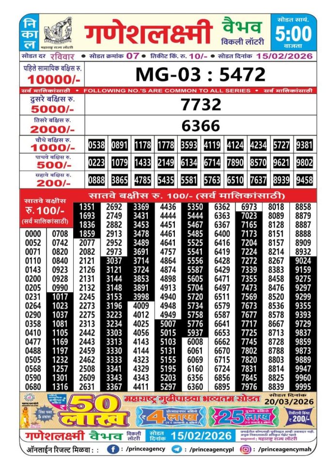 Maharashtra Ganesh Laxmi Weekly Lottery Result 15.02.2026