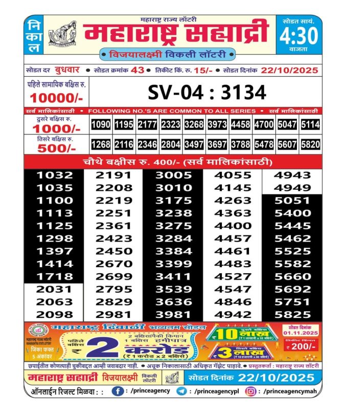 Maharashtra Sahyadri Weekly Lottery 4.30 PM Result 22.10.2025