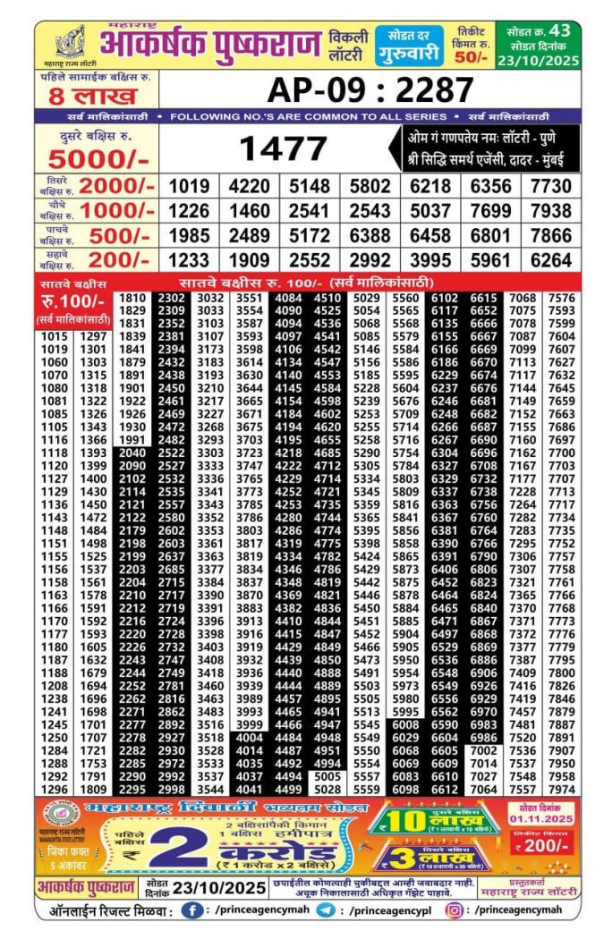 Maharashtra Sahyadri Weekly Lottery 4.30 PM Result 23.10.2025