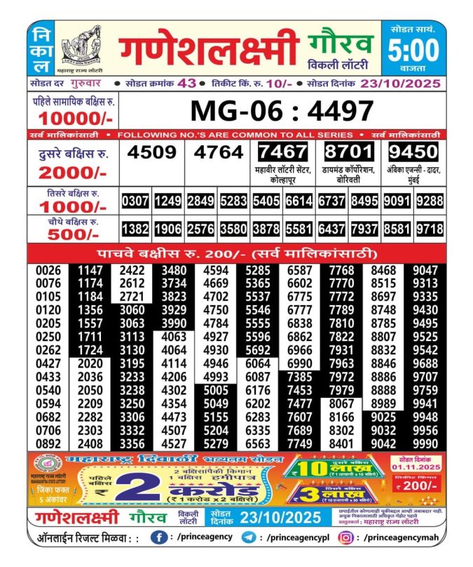 Maharashtra Ganeshlaxmi Weekly Lottery 5 PM Result 23.10.2025