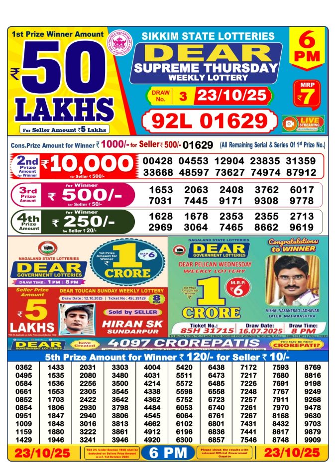 Dear Supreme Thursday Weekly Lottery 6 PM Result 23.10.2025