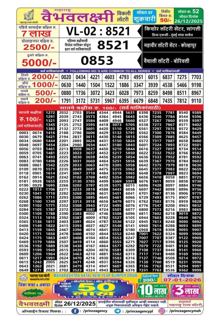 Maharashtra Vaibhavlaxmi Weekly Lottery Result 26.12.2025