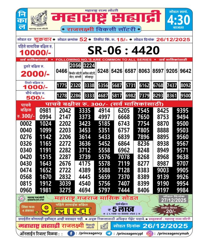 Maharashtra Sahyadri Weekly Lottery  Result 26.12.2025
