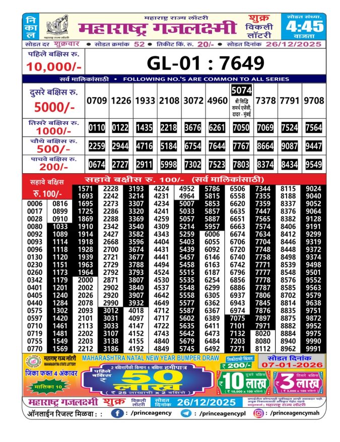Maharashtra Gajlaxmi Lottery Result 26.12.2025