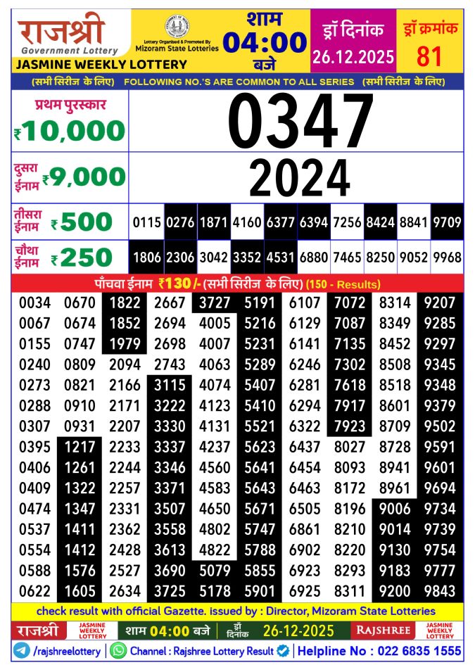 Rajshree Jasmine Weekly Lottery 4 PM Result 26.12.2025