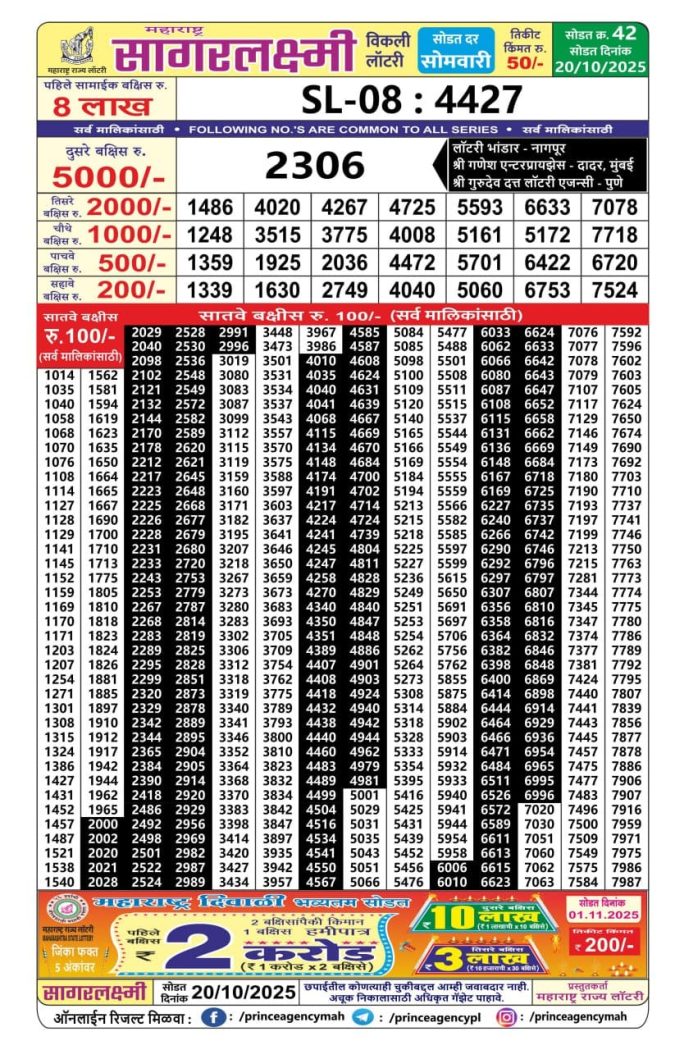 Maharashtra Sagar Laxmi Weekly Lottery 4.15 PM Result 20.10.2025
