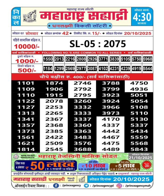Maharashtra Sahyadri Weekly Lottery 4.30 PM Result 20.10.2025