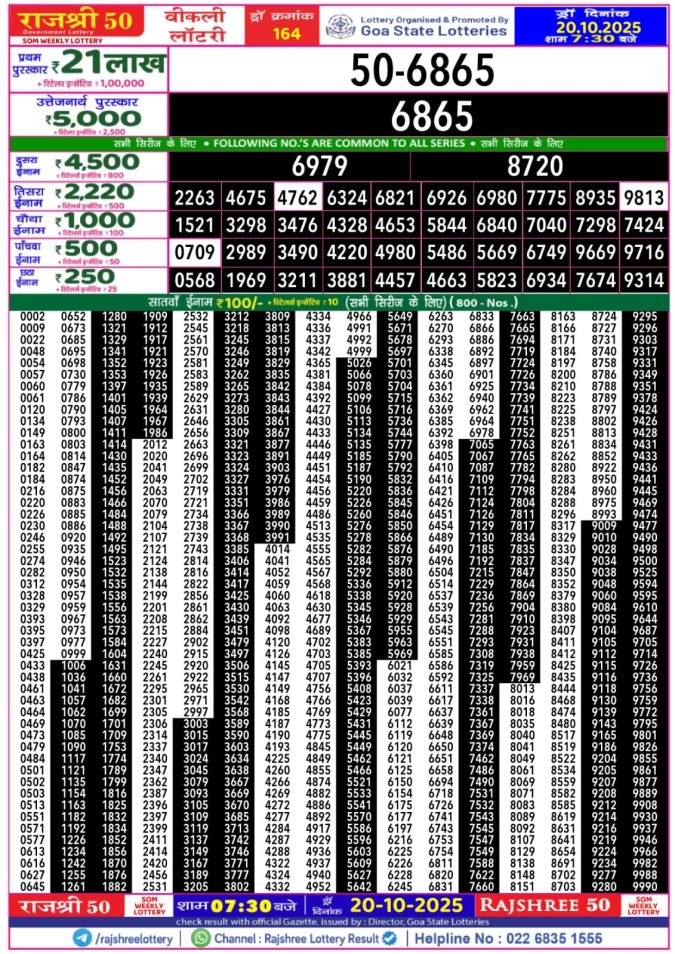 Rajshree 50 Som Weekly Lottery 7:30 PM Result 20.10.2025