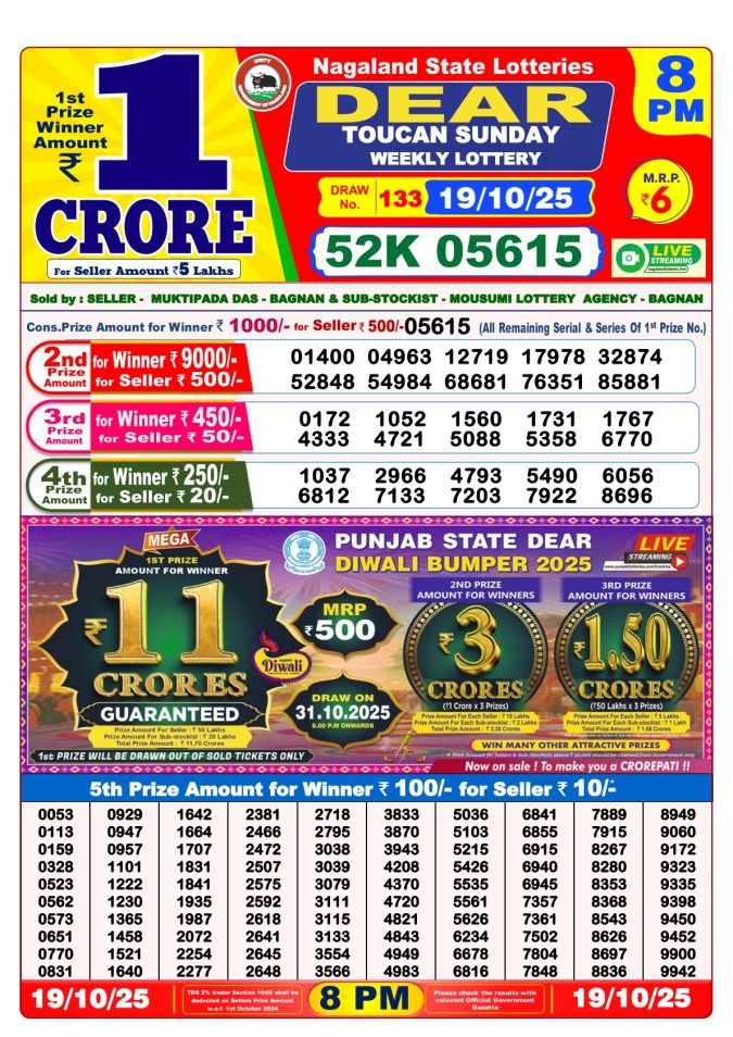 Dear Toucan Sunday Weekly Lottery 8 PM Result 19.10.2025