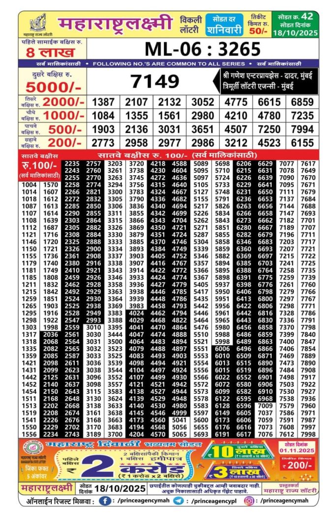 Maharashtra Laxmi Weekly Lottery 4.15 PM Result 18.10.2025