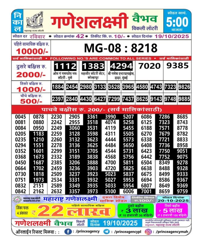 Maharashtra Ganeshlaxmi Weekly Lottery 5 PM Result 19.10.2025