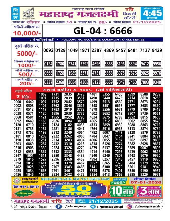 Maharashtra Gajlaxmi Lottery Result 21.12.2025