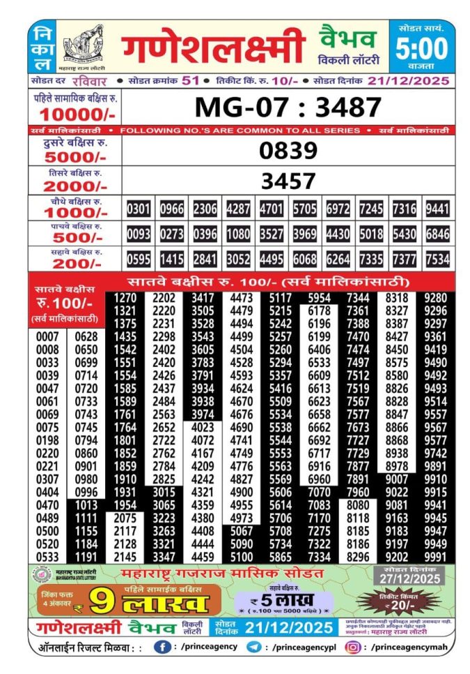 Maharashtra Ganeshlaxmi Weekly Lottery  Result 21.12.2025