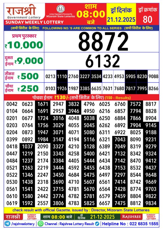 Rajshree Sunday  Weekly Lottery 8 PM Result 21.12.2025