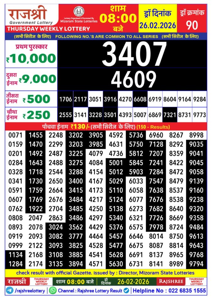 Rajshree Thursday Weekly Lottery 8 PM Result 26.02.2026