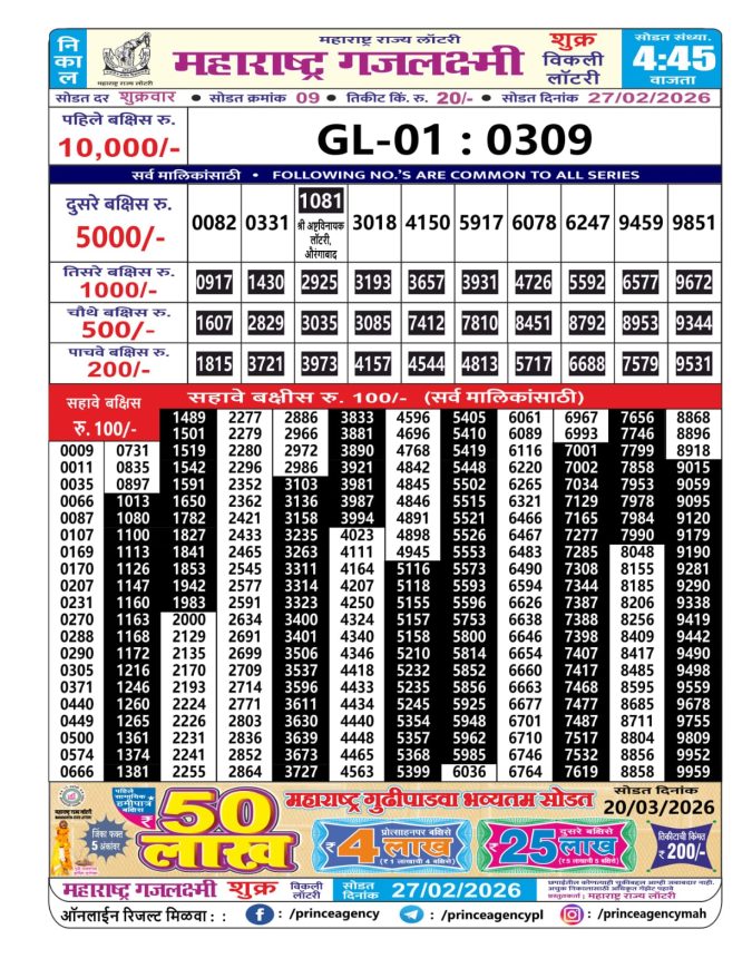 Maharashtra Gajlaxmi Weekly Lottery Result 27.02.2026