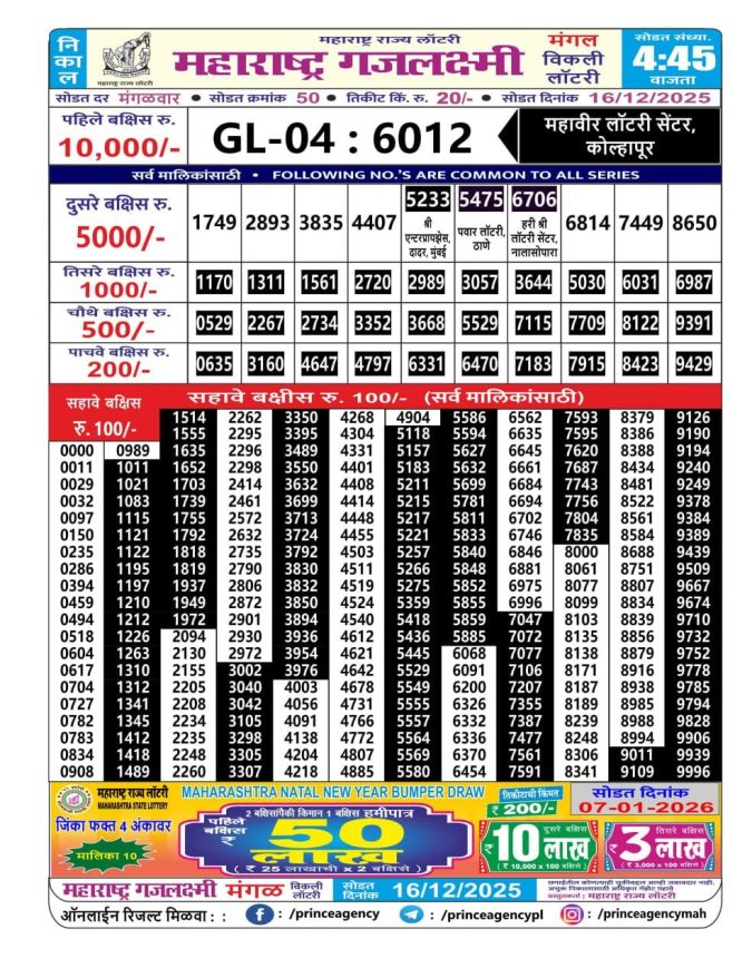 Maharashtra Gajlaxmi Lottery Result 16.12.2025