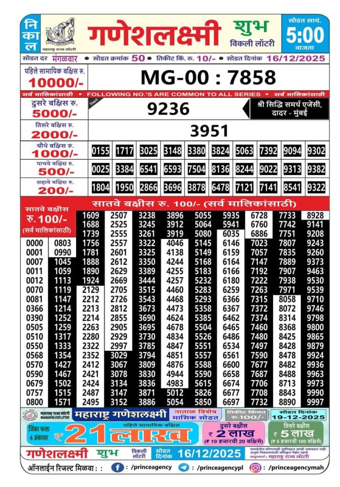 Maharashtra Ganeshlaxmi Weekly Lottery  Result 16.12.2025