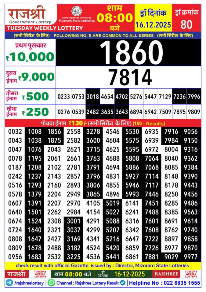 Rajshree Tuesday Weekly Lottery 8 PM Result 16.12.2025