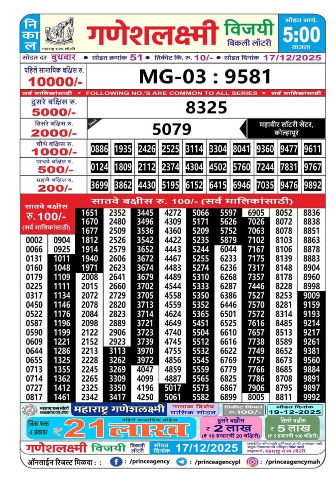 Maharashtra Ganeshlaxmi Weekly Lottery  Result 17.12.2025