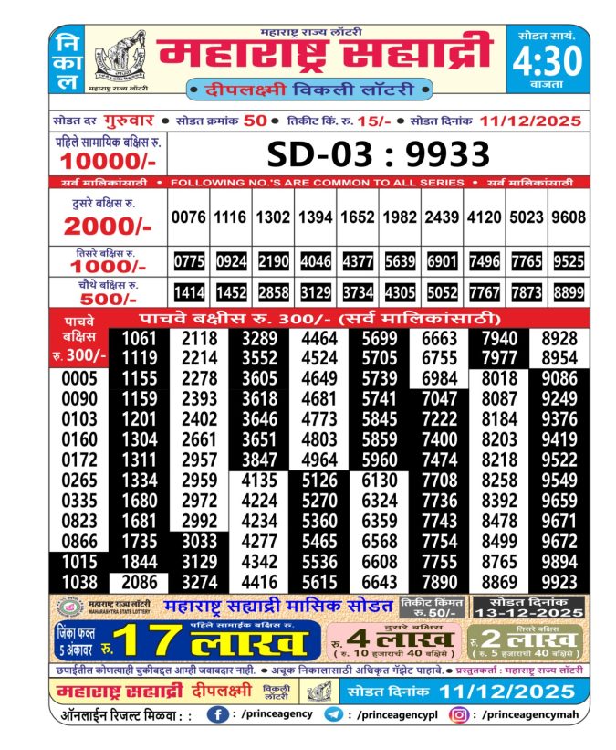 Maharashtra Sahyadri Weekly Lottery  Result 11.12.2025