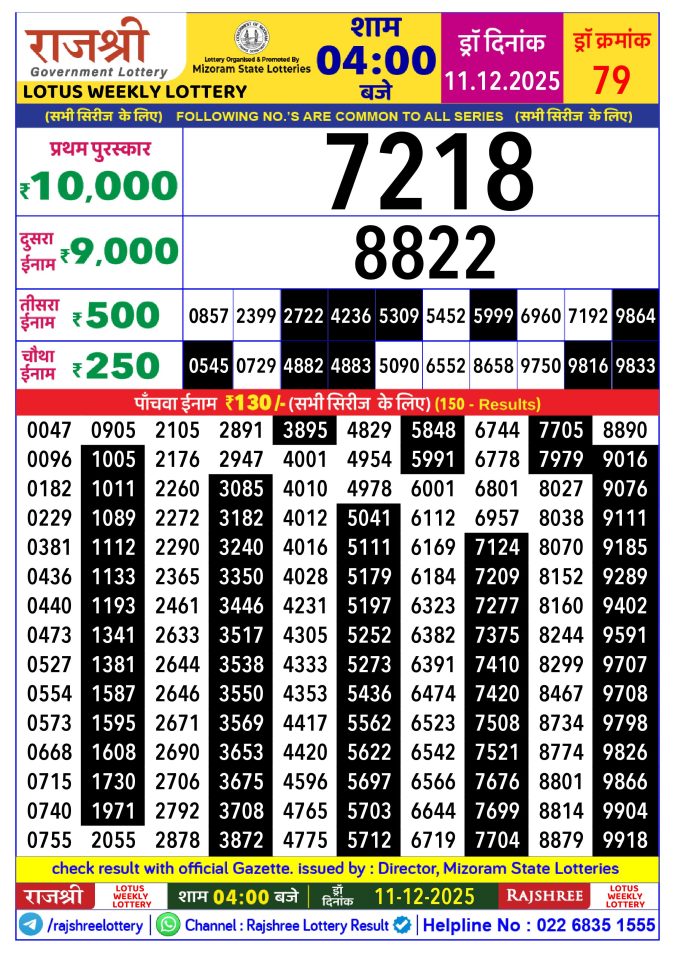 Rajshree Lotus Weekly Lottery 4 PM Result 11.12.2025