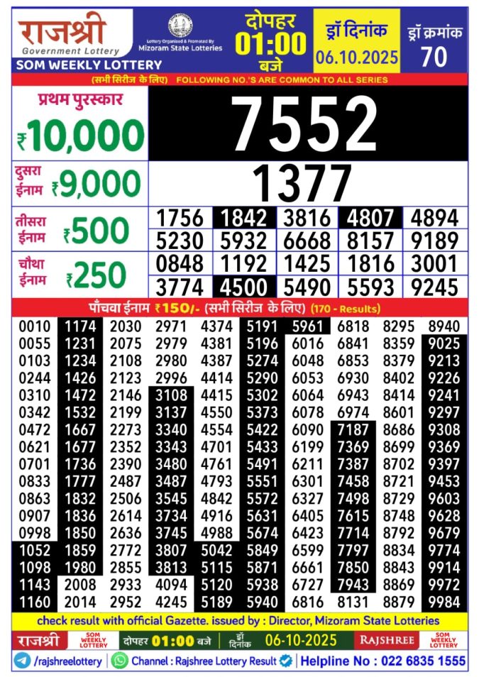 Rajshree Som Weekly Lottery 1 PM Result 06.10.2025