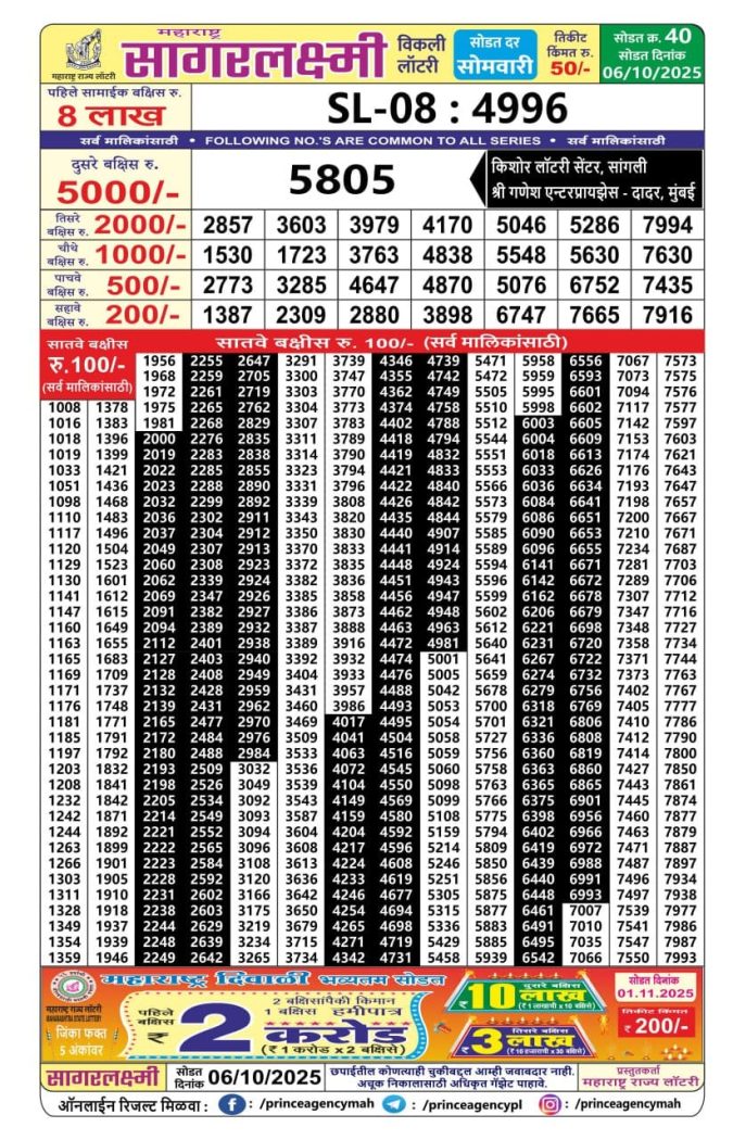 Maharashtra Sagar Laxmi Weekly Lottery 4.15 PM Result 06.10.2025