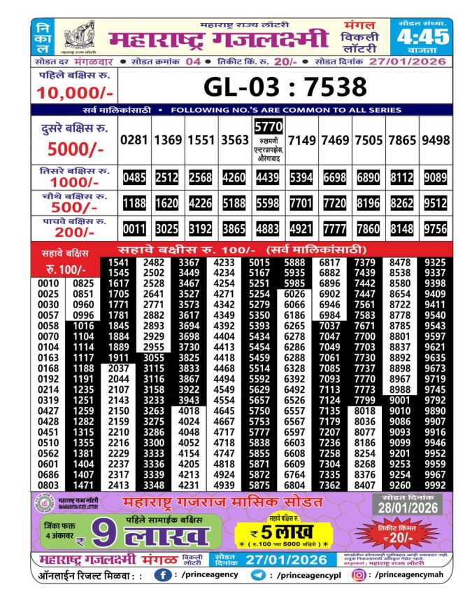 Maharashtra Gajlaxmi Weekly Lottery Result 27.01.2026